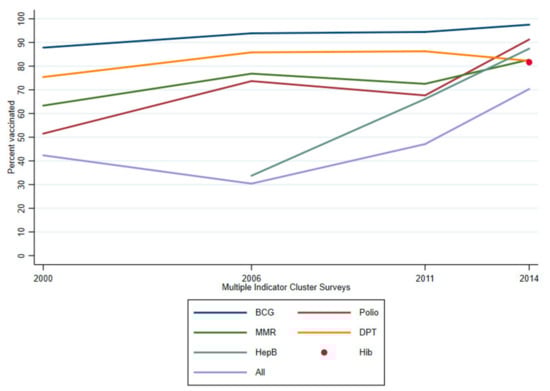 After 25 to 30 years of Doi Moi* 1986 (Doi Moi (English: Renovation) is the name given to the economic reforms initiated in Vietnam in 1986 with the goal of creating a “socialist-oriented market economy”. The term ‘Doi Moi’ itself is a general term with wide use in the Vietnamese language), Vietnam achieved great progress for its 26 million children in a remarkably short time []. In an effort to achieve Millennium Development Goals (MDGs) to reduce child mortality, Vietnam reduced the under-five mortality rate from 58 per 1000 live births to 24 per 1000 between 1990 and 2009 []. Despite this fact, since 2005, the under-five mortality rate in Vietnam has been higher than the average figure for countries in the East Asian and Pacific region [,]. Currently, a large number of Vietnamese children still die before they reach their first birthday. Therefore, it is actually important to understand the general trend of the full immunization coverage, individual trends of the recommended vaccines over the years, and issues surrounding vaccination. Little is known about the situation of socioeconomic inequalities in the full vaccination coverage among children in developing countries, especially in Vietnam, a country that remains popular with infectious diseases. Therefore, the aim of this study is to assess the trends and changes in the socioeconomic inequalities in the full vaccination coverage among Vietnamese children aged 12–23 months from 2000 to 2014 based on the most recently available data of the United Nations Children’s Fund (UNICEF).