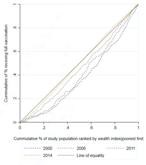 We also applied the technique of concentration curve (CC) to estimate the degree of the socioeconomic inequalities [,]. The CC plots the cumulative percentage of the full vaccination coverage among children aged 12–23 months (on y-axis) against the cumulative percentage of wealth index ranked from the poorest to the richest (on x-axis). The diagonal line from the origin that reflects perfect equality is a linear line at 45° (line of equality). The farther the CC lies above the line of equality, the higher the concentration of the full vaccination coverage among 12–23-month-old children that belong to the poor households. If the CC lies below the 45° line, the full vaccination coverage concentrates among the rich. The further away the CC is from the 45° line, the greater the degree of the socioeconomic inequalities in the full vaccination coverage.