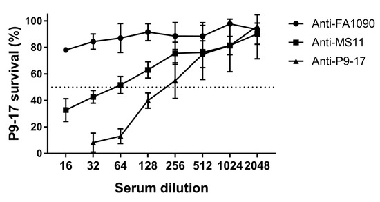 Measurement of cross-reactive SBA to N. gonorrhoeae P9-17 by detection of ATP. Serial twofold dilutions of murine sera raised to OMV extracts from N. gonorrhoeae P9-17, FA1090 or MS11 were incubated with N. gonorrhoeae P9-17 and bacterial survival measured by ATP (luminescence). Data are combined means ± SD from three independent experiments.