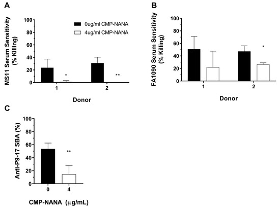 Reduction of serum or SBA sensitivity or after sialylation with cytidine-5′-monophospho-N-acetylneuraminic acid (CMP-NANA). Mid-log broth subcultures of N. gonorrhoeae MS11 (A) or FA1090 (B) were incubated with/without the addition of 4 μg/mL CMP-NANA and samples taken to detect bacterial ATP. The P9-17 strain (C) was incubated under the same conditions with the addition of murine anti-P9-17 OMV anti-sera at a dilution of 1/64 to examine the effect of sialylation on SBA. Data are combined means + SD from three independent experiments; statistically significant differences in sensitivity were determined using multiple t-tests with the Holm–Šidák method applied (A,B) or a paired t-test (C). Values were reported as zero in experiments where bacteria numbers had increased in the presence of NHS. * p < 0.05; ** p < 0.01.