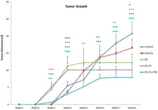 Tumor volume and tumor incidence in a mouse model. Tumor volume was measured every three days from the time tumor was palpable (day 14) until week 8, when all the animals were sacrificed (n = 3 per group). Animals in the control group did not receive any form of intervention; animals in the vehicle group were fed with soy oil; animals in the DC alone group received un-pulsed DC; animals in the DC + TL group received DC pulsed with tumor lysate from 4T1 cells; and the animals in the DC + TL + TRF group received DC + TL and daily supplementation of TRF. Data were analyzed using one-way ANOVA followed by the post-hoc Tukey multiple comparison test for pair-wise comparison. Results are shown as the mean ± SEM (* p < 0.05, ** p < 0.01, *** p < 0.001: significant compared to control group).