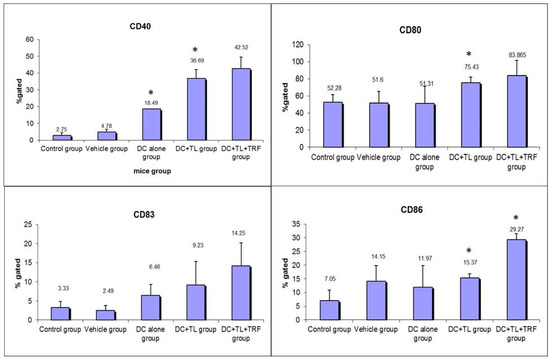 The expression of CD40, CD80, CD83, and CD86 on the PBL of mice was performed as these molecules are reported to play key roles in antigen presentation to T-cells [25,26]. These molecules provide co-stimulatory signals that required for T-cell activation and survival. There was an increase in the expression of these cell surface molecules on PBL obtained from mice from the DC + TL + TRF group (Figure 2).
