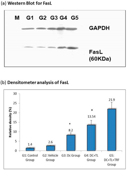 (a) A cell lysate preparation was prepared from the tumors harvested from the experimental mice as described before (n = 3 per group). Protein levels in the cell lysate were determined using the Bradford assay. Then, the cell lysate was subjected to SDS-PAGE, followed by Western blotting assay to estimate the level of FasL protein expression in these samples and then (b) the intensity of the expression was quantified using densitometry analysis (Image J, Software based on image processing program developed at National Institutes of Health). The results from the densitometer was analyzed using Student’s t-test for comparison with the expression in the control group. * denotes a significant difference from the control group (p < 0.05). M: Protein marker; G1: control group; G2: vehicle group; G3: DC group; G4: DC + TL group; G5: DC + TL + TRF group.
