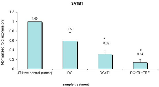 To verify the findings from the microarray analysis, the expression of SATB1 gene in the tumor tissues extracted from the three DC-treated groups (DC alone, DC + TL, and DC + TL + TRF) was analyzed using quantitative PCR (qPCR). Total RNA extracted from cultured 4T1 cells was also included in the analysis. A marked (p < 0.05) reduction in the expression of SATB1 gene was observed in tumors extracted from mice treated with DC + TL + TRF (Figure 5). This showed that there was consistency in results between the qPCR and microarray analyses. However, it should be noted that there were differences in the level of expression between qPCR and microarray analyses. In tumors from the DC + TL + TRF, the expression of SATB1 was only 0.14-fold (Figure 5), whilst in the microarray analysis, the fold change noted was 0.396 (Table 4). Tumors from the DC + TL + TRF (0.14) as well as DC + TL (0.32) groups had significantly (p < 0.05) lower expression of the SATB1 gene when compared to DC alone (0.59) or cultured 4T1 cells (1.0) (Figure 5).