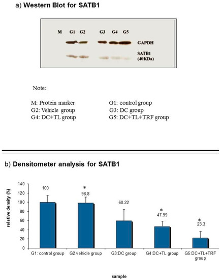 Western blotting analysis confirmed the results from the gene expression studies. There was a significant reduction in the expression of the SATB1 protein expression in tumors from the DC + TL + TRF and DC + TL groups when compared to tumors from the control or vehicle groups (Figure 6a). When the densitometry analysis was performed, the results showed that the SATB1 expression to be reduced in DC + TL + TRF (23.3% of relative density) group compared to other groups (Figure 6b). The control and vehicle groups showed almost similar expressions (100%, 98.8% of relative density) of the SATB1 protein. The relative densities of SATB1 protein expression in the DC alone and DC + TL groups were 60.22% and 47.99%, respectively (Figure 6b).