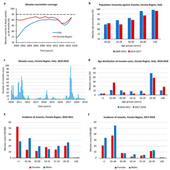 Measles vaccination coverage and seroprevalence. (a) Percentage of uptake of one dose of measles-containing vaccine in children aged 24 months in the Veneto Region and Italy during the period from 2000 to 2017. (b) Prevalence of measles-specific IgG antibodies in employees of the University of Padova and Padova University Hospital, Veneto Region, Italy. Two periods (2009–2012 and 2014–2017) were compared. (c) Epidemic curve of 1005 measles cases in the Veneto Region, Italy, from January 2010 to December 2018. (d) Distribution of measles by age group during the 2010–2011 and the 2017–2018 outbreaks in the Veneto Region, Italy. (e) Incidence of measles by age and sex groups during the 2010–2011 and (f) the 2017–2018 outbreaks in the Veneto Region, Italy.
