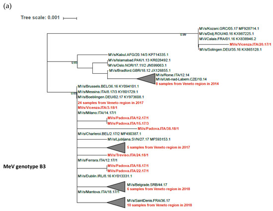 Measles outbreaks that occurred in the Veneto Region during the last decade were caused by the same MeV genotype B3, D4, and D8 strains that were circulating in other Italian Regions and European countries. Measles is a highly contagious infectious disease, and MeV strains rapidly circulate with traveling people, causing disease globally, such as in the case of the recently emerged MeV genotype B3 strain [2]. To get a more detailed picture of measles transmission networks, we sequenced the full viral genome from clinical samples collected from subjects involved in different transmission clusters. A phylogenetic analysis identified transmission patterns different from those indicated by conventional epidemiological investigation, thus supporting the utility of full viral genome sequencing for the epidemiological investigation of measles outbreaks [33].