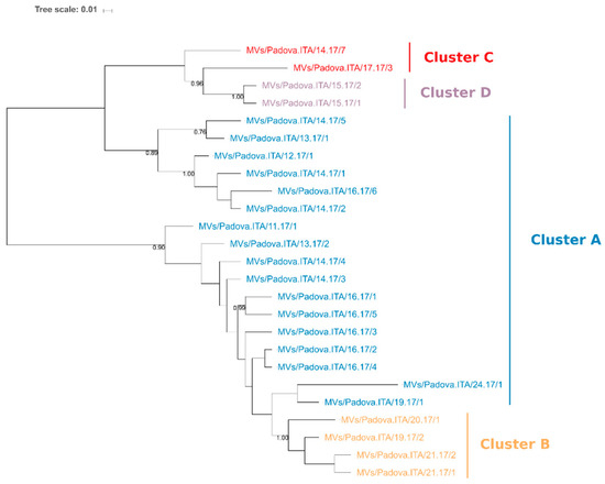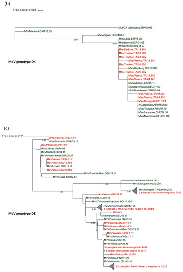 MeV genotypes D4 and D8 co-circulated in the Veneto Region during the 2010–2011 outbreak and accounted for 53% and 45% of sequenced MeV strains, respectively, while MeV genotypes B3 (72%) and D8 (28%) co-circulated during the 2017–2018 outbreak. Within these MeV genotypes, phylogenetic analysis showed the presence of different variants in transmission clusters, which is consistent with multiple introductions of the virus (Figure 2).