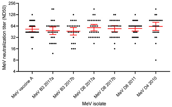 The results of MeV neutralization assays in a group of healthy subjects vaccinated with two doses of measles-containing vaccines showed that all subjects had neutralizing antibodies against the MeV vaccine strain and the clinical isolates of epidemic MeV genotype B3, D4, and D8 strains, without significant differences in neutralization titers among sera with different levels of MeV IgG antibodies. In addition, the cross-neutralizing antibody titers against the epidemic MeV strains were not significantly different from the neutralization titers against the vaccine strain (Figure 4).