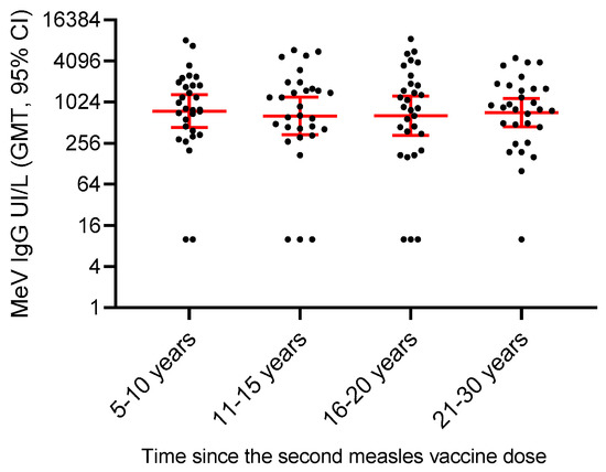 To evaluate the persistence of measles vaccine-induced immunity, the titers of MeV IgG antibodies were analyzed in a group of subjects for whom information on measles vaccination status was available and who had received ≥2 doses of measles-containing vaccine. This analysis showed the presence of protective MeV IgG antibody titers (i.e., >0.120 UI/mL) in over 90% of subjects and the persistence of sustained antibody levels up to 30 years after vaccination (Figure 6), in agreement with previous reports [30].