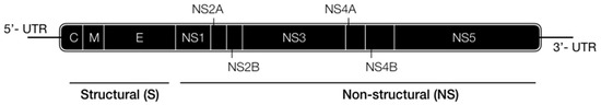The virus itself is a 50 nm virion constructed from Capsid (C), preMembrane/Membrane (prM/M), and Envelope (E) protein in a lipid envelope [15]. Inside is a 10.7 kb positive sense capped RNA (+RNA) genome which also encodes seven non-structural proteins (NS1, NS2A, NS2B, NS3, NS4A, NS4B, and NS5; Figure 1) [15].