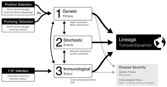 DENV lineages have been associated with varying disease severity [149] and transmission rates [147,150], therefore an understanding of these dynamics would greatly aid future intervention methods including vaccine design. However, in the field there is considerable controversy regarding the factors modulating lineage dynamics, with many papers supporting alternative hypothesises [142,144,146,147,150,151,152,153]. Although, most agree that as yet we do not have a firm enough grasp to predict these dynamics. Within the field, three different factors have each been hypothesised to control dengue dynamics; (i) genetic fitness, (ii) population immunological status, and (iii) stochastic events, each with supporting evidence from the field [142,144,146,147,150,151,152,153]. This controversy is likely a consequence of the multifactorial nature of dengue infection dynamics. Coincidently, recent work [142,144,146,154] is starting to appreciate that all three factors likely contribute in a complex cross-talk. Using the current sphere of knowledge, a hypothetical diagrammatic representation of this complex dynamic process has been created (Figure 2), which is discussed in detail below.