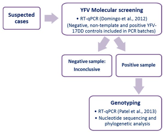 - Domingo, C.; Patel, P.; Yillah, J.; Weidmann, M.; Mendez, J.A.; Nakoune, E.R.; Niedrig, M. Advanced Yellow Fever Virus Genome Detection in Point-of-Care Facilities and Reference Laboratories. J. Clin. Microbiol. 2012, 50, 4054–4060. [Google Scholar] [CrossRef] [PubMed]