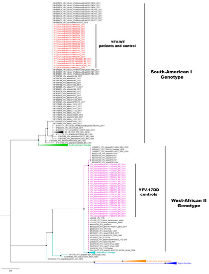 We received the results of anti-YFV IgM test (in house MAC-Elisa) of some patients performed at Fundação Ezequiel Dias (FUNED). Nine patients were anti-YFV IgM negative, and three were anti-YFV IgM positive (Table 1). It was possible to genotype YFV in samples collected from the second to the 16th day after the onset of symptoms, including three IgM-positive samples (Table 1).