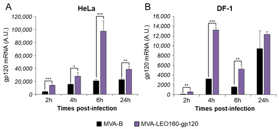To determine whether MVA-LEO160-gp120 could enhance the expression levels of HIV-1 gp120, in comparison to MVA-B, HeLa or DF-1 cells were infected with MVA-B and MVA-LEO160-gp120 at a MOI of 5 PFU/cell for 2, 4, 6, and 24 h. Then, total RNA was isolated and mRNA levels of HIV-1 gp120 were determined by RT-qPCR. The results showed that MVA-LEO160-gp120 significantly increased HIV-1 gp120 transcription compared to MVA-B in either HeLa (Figure 2A) or DF-1 cells (Figure 2B). Noticeable are the differences observed in mRNA levels at early times post infection, highlighting the robust increase in gene expression achieved by the LEO160 promoter.