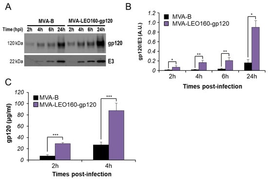 To further analyze whether there were differences in cell released of soluble HIV-1 gp120 protein to the extracellular medium, supernatants derived from HeLa cells infected with MVA-B or MVA-LEO160-gp120 were collected at 2, 4, 6, and 24 hpi and concentrated using Amicon® Ultra-15 Centrifugal Filters (Millipore, Burlington, MA, USA). The total amount of HIV-1 gp120 protein present in the supernatants was quantified by ELISA using a standard curve of purified HIV-1 gp120BX08 protein. The results showed that MVA-LEO160-gp120 released more soluble HIV-1 gp120 to the extracellular medium than MVA-B at early times post-infection (2 and 4 h) (Figure 3C), but at later times post-infection (6 and 24 h), there were no significant differences between MVA-LEO160-gp120 and MVA-B in the total amount of HIV-1 gp120 protein released to the supernatant, probably mediated by cytopathic and apoptosis induction.
