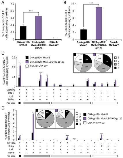 Furthermore, the quality of the Env-specific T cell adaptive immune responses was characterized in part by the pattern of cytokine production and its cytotoxic potential. Thus, on the basis of the production of CD107a, IFN-γ, TNF-α, and IL-2 from HIV-1 Env-specific CD4+ and CD8+ T cells, 15 different HIV-1 Env-specific CD4+ and CD8+ T cell populations could be identified (Figure 4C,D). As shown in Figure 4C (pie charts), Env-specific CD4+ T cell responses were similarly polyfunctional in both vaccinated groups, with around 80% of the CD4+ T cells exhibiting two or more functions. CD4+ T cells expressing CD107a+IFN-γ+TNF-α+IL-2, CD107a+TNF-α+IL-2 or IFN-γ+TNF-α+IL-2 were the most induced populations elicited by both vaccinated groups, but DNA-gp120/MVA-LEO160-gp120 induced a significantly greater percentage of these major populations than DNA-gp120/MVA-B (Figure 4C, bars). On the other hand, as shown in Figure 4D (pie charts), DNA-gp120/MVA-B and DNA-gp120/MVA-LEO160-gp120 have a similar polyfunctional profile of Env-specific CD8+ T cell responses, with 85% and 87% of the CD8+ T cells exhibiting two or more functions, respectively. CD8+ T cells expressing CD107a+IFN-γ+TNF-α was the most abundant population elicited by both vaccinated groups, but once again DNA-gp120/MVA-LEO160-gp120 induced a significantly greater increase in the percentage of this population, and others, than DNA-gp120/MVA-B (Figure 4D, bars).