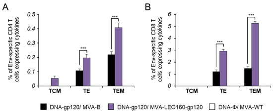 It has been described that HIV-1-specific T cells of a mature effector memory phenotype are more frequently detectable in HIV-1 controllers than in HIV-1 progressors [46,47,48]. Thus, next we determined the memory phenotype of HIV-1 Env-specific CD4+ and CD8+ T cells by measuring the expression of the CD127 and CD62L surface markers, which allow the definition of the different memory subpopulations: T central memory (TCM, CD127+/CD62L+), T effector memory (TEM, CD127+/CD62L−), and T effector (TE, CD127−/CD62L−) cells [49], and determined as the sum of the individual responses expressing CD107a, IFN-γ, TNF-α, and/or IL-2 obtained for the Env peptide pool (Figure 5). The results showed that in both vaccinated groups, Env-specific CD4+ and CD8+ T cells were mainly of the TEM phenotype, followed by the TE phenotype. However, immunization with DNA-gp120/MVA-LEO160-gp120 induced a significantly greater increase in the percentage of Env-specific CD4+ and CD8+ TEM and TE cells than immunization with DNA-gp120/MVA-B (Figure 5).