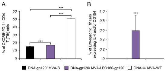 The development of HIV-1 broadly neutralizing antibodies (bNAbs) has been previously correlated with the frequency and quality of CD4+ T follicular helper (Tfh) cells [50,51]. This subpopulation of T helper cells is involved in the development and sustaining of germinal center (GC) interactions, an essential crosstalk that promotes the generation of long-lived high-affinity humoral immunity. Since the interaction between Tfh and B cells is mediated both by cell-associated and soluble factors, including CD154 (CD40L), ICOS, IL-21, IL-10, and IL-4 [52], the Env-specific CD4+ Tfh cell responses were studied analyzing those parameters by ICS assay in splenocytes obtained from immunized mice at 10 days after the last immunization. Thus, splenocytes were non-stimulated (RPMI) or stimulated ex vivo for 6 h with HIV-1 gp120BX08 protein plus Env peptide pool. Frequencies of total CD4+ T cells with Tfh phenotype (CXCR5+, PD1+) were significantly higher in animals immunized with DNA-gp120/MVA-LEO160-gp120 than in those immunized with DNA-gp120/MVA-B; in both cases, the frequencies were lower than in animals of control group DNA-ϕ/MVA-WT (Figure 6A), probably due to an immunosuppressive function of the HIV-1 Env protein. Afterwards, the HIV-1 Env-specific Tfh response was evaluated by quantifying the percentage of CD4+ Tfh cells that produced CD154 and/or IL-21 and/or IL-4. Since about 70% of the CD4+ Tfh cells obtained in the non-stimulated (RPMI) or stimulated (with the gp120BX08 protein plus the Env peptide pool) conditions were positive for IL-21, whereas in the CD4+ non-Tfh population only 2% of the cells were IL-21+, the Env-specific Tfh response was finally established by analyzing the percentage of CD4+ Tfh cells that produced CD154 and/or IL-4 after stimulation, in comparison with non-stimulated cells (Figure 6B). The results showed that the magnitude of the HIV-1 Env-specific Tfh response induced by animals immunized with DNA-gp120/MVA-LEO160-gp120 was significantly higher than in animals immunized with DNA-gp120/MVA-B (Figure 6B).