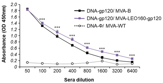 Humoral immune responses elicited by DNA-gp120/MVA-B and DNA-gp120/MVA-LEO160-gp120 against HIV-1 gp120 protein. Levels of gp120-specific total IgG binding antibodies were measured by ELISA in pooled sera from mice immunized with DNA-gp120/MVA-B, DNA-gp120/MVA-LEO160-gp120 or DNA-ϕ/MVA-WT (n = 5) 10 days after the last immunization. Mean absorbance values (optical density (OD) measured at 450 nm) and standard deviations of duplicate pooled serum dilutions are represented. P values indicate significant differences in antibody levels between the DNA-gp120/MVA-B and DNA-gp120/MVA-LEO160-gp120 immunization groups at each serum dilution (***, p < 0.001).