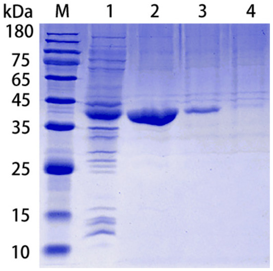 Purification of rPotD protein. Lane 1: Ultrasonic-lysed crude protein of pET-potD-BL21(DE3); lane 2: purified rPotD protein (dialyzed, ultra-filtrated); lane 3: purified rPotD protein (without being ultra-filtrated); lane 4: low concentration of elution buffer; M: protein molecular mass standard (Novoprotein).