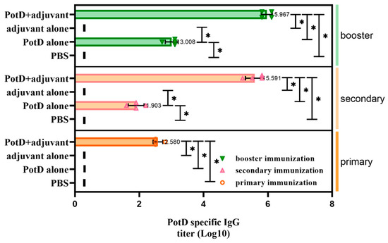 Determination of specific IgG titers in serum samples collected from each mouse after receiving three rounds of immunization. IgG titers were determined using indirect ELISA coated with purified recombinant PotD protein. The titer was defined as the absorbance of the highest dilution at 450 nm which was at least 0.1 above that of the background wells in which serum samples were replaced with PBS. Short vertical lines indicate value below detection limit. These experiments were repeated four times. Each error bar represents one standard deviation from the mean.