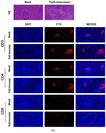 In addition to the finding that rPotD can actively elicit the humoral immune response, we further performed IF and FCM analyses to determine whether rPotD could trigger the upregulation of certain T cells in mice. The spleens of three mice in each group were treated with FFPE and used for routine IF analysis. The fluorescence staining showed that all CD molecules were located on the surface of spleen lymphocytes, forming circular fluorescence bodies (Figure 3B). IODR assay of normal spleen tissues revealed low-threshold immunofluorescence in white pulp area (Figure 3A). However, no conspicuously visible CD molecule could be observed in red pulp area. Closer inspection of the relative expression levels of immunocyte CD3+/CD4+/CD8+ revealed that all CD3+/CD4+/CD8+ were upregulated to almost twice that of the mock group upon inoculating rPotD+adjuvant in mice (p < 0.05). Clumping of T cells CD3+ and CD4+ clustered in white pulp area, while CD8+ was scattered in red pulp area, despite a low fluorescence intensity. However, mice immunized with pure adjuvant solely or injected with PBS only showed insignificant fluctuations in cell line levels, when compared with the mock group (p > 0.05) (Figure 3B).