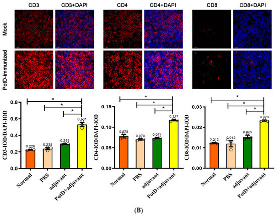 In FCM assay, total T cells (mature T lymphocytes) and the T cell subsets T-helper cells (CD4+) and T suppressors/cytotoxic T-cells (CD8+) were quantitated in a representative peripheral blood sample of untreated or immunized mice (fluorescence-activated cell sorting, FACS, Supplementary Materials, Figure S1). The distribution of CD8+ leukocyte infiltrates was somewhat different from the findings in IF assay. In two independent experiments, CD8+ respectively accounted for 14.18% and 14.61% of the whole cells (Figure S1), which were even slightly lower than those in the mock group, presumably because the different sensitivities in different detection methods and/or different samples (spleen tissue vs. peripheral blood), but the differences were not significant (p > 0.05). However, immunized mice-blood samples displayed magnification of CD3 and CD4 T lymphocytes (CD3+, CD4+) frequencies (p < 0.05). Relative CD3+ counts rose from 24.3% to a robust 33.76%/40.4% cells; CD4+ increased from 16.61% to 23.86%/29.08% cells (p < 0.05). On the other hand, CD4+/CD8+ increased from 0.931 (16.61/17.84) to 1.648 (23.86/14.48)/1.990 (29.08/14.61); this was presumably attributable to the immunization of rPotD. Significantly, both the CD3+ and CD4+ count and CD4+/CD8+ ratios were upregulated almost one and a half times that observed in the mock group, which was in accordance with the findings in the IF assay, where their relative fluorescence intensities (IODR) nearly doubled in mice inoculated with rPotD+adjuvant.