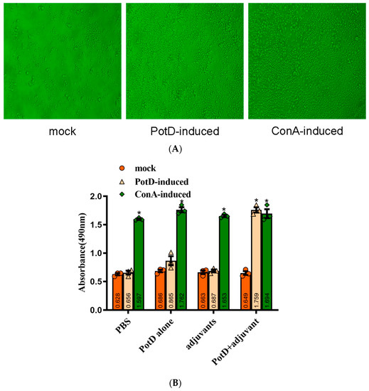 Lymphocyte Proliferation Assay. Two weeks after the booster immunization, the splenocytes (1 × 106 cells/well) from immunized groups and mock group were cultured with 10 μg/well of proteins and ConA (positive control) for 72 h at 37 °C with 5% CO2. Levels of lymphocyte proliferation in each group were detected using an MTS method and the absorbance at 490 nm (A490nm) was measured using a Varioskan Flash (Thermo Scientific). (A) Microexamination of spleen lymphocyte proliferation in the mice immunized with rPotD+adjuvant. (B) Spleen lymphocyte proliferation analysis. These experiments were repeated three times. Each error bar represents one standard deviation from the mean.
