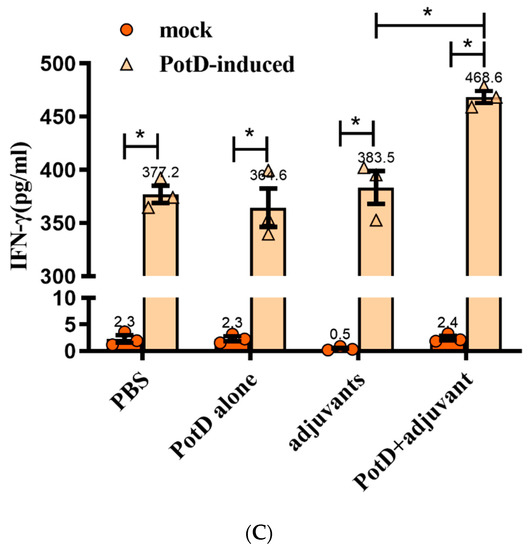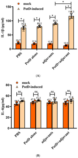 Cytokines (CK) are signaling molecules that modulate inflammatory response components of the immune system during tissue damage and repair. Cytokines can be divided into interleukin (IL), interferon (IFN), and tumor necrosis factor (TNF) superfamily, colony stimulating factor (CSF), and chemokine and growth factor (CF and GF). Here, we preliminarily tested two interferons (IL-1β and 4) and an interferon (IFN-γ) to determine the immune response type ensuing rPotD stimulation. The levels of pro-inflammatory cytokines IL-1β and IFN-γ from the supernatants of splenocytes were stimulated with rPotD in all experimental groups (splenocytes from mice immunized with PBS/rPotD alone/adjuvant alone/rPotD+adjuvant) were significantly higher in the mice vaccinated with rPotD when compared with the mock groups (Figure 5A,C, p < 0.05). However, there was no increase in IL-4 levels in all experimental groups (Figure 5B, p > 0.05), indicating that immunization of mice with rPotD triggered a Th1-type immune response, rather than Th2-type.