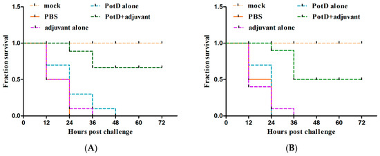 The survival rate of mice challenged with a lethal dose (1.4 × 109 CFU/mouse) of H. parasuis SH0165. (A) In active immunization, PBS/rPotD-alone/adjuvant-alone groups triggered 100% (10/10) death in mice model within 48 h post-injection, while rPotD+adjuvant group engendered only 30% (3/10) of death within a 72 h-period observation. (B) In passive immunization, all the mice receiving antisera elicited by PBS/ rPotD alone/adjuvant alone died after the challenge with H. parasuis SH0165 within 36 h. One half of mice (5/10) immunized passively with antisera from rPotD mixed with adjuvant were protected from the lethal H. parasuis challenge. Mock group indicates mice that were neither vaccinated nor challenged with SH0165, while PBS group indicates mice receiving both PBS inoculation and bacteria injection. All assays were performed at least two times independently. Survival data were recorded every 12 h for a period of 72 h and plotted using GraphPad Prism v. 8.0.2.