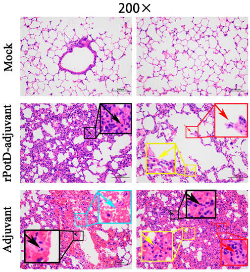 Histopathologic analysis of mice lungs (200×). Lung tissues were harvested from mice in different groups after 72 h dpi, and used for histological examination (H&E) staining and histopathological assay. Mock group (Mock): no visible pathological damage. rPotD-adjuvant group: thickening alveolar walls and inflammatory cells infiltration (black arrow); expanded alveoli, thinner alveolar walls (yellow arrow); broken alveolar walls (red arrow). Adjuvant-alone group: necrosis, karyopycnosis and hyperchromatism and fragmentation of the epithelial cells in the alveolar walls (black arrow); inflammatory cells infiltration (red arrow); dilated capillaries congested with red blood cells (yellow arrow); local hemorrhage (blue arrow).