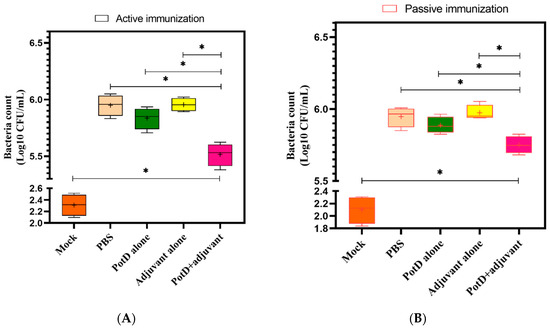 To assess the specific pathogen scavenging ability of PotD in the innate immune response in vivo, we subjected SPF BALB/c mice to a HLD of H. parasuis strain SH0165. Lung tissue homogenates were diluted serially and cultured on nalidixic acid-containing TSA++ overnight prior to counting the visible bacterial colonies (in a series of dil. 101–107). In the mock group, the number of visible bacteria ranged from 125–327 CFU/mL in active immunization, and 69–204 CFU/mL in passive immunization, severing as a background reference value. As expected, a statistically significant decrease in viable bacteria was detected in lung tissue homogenate from rPotD+adjuvant-immunized mice compared to those from all the other non-effective immune groups (Figure 8). Thus, we concluded that Hp–rPotD could trigger effective clearance of H. parasuis during acute pneumonia to prevent systemic infections. This may underscore the way in which rPotD+adjuvant-immunization could protect mice from certain dose of H. parasuis infection under lab conditions and may possess the potential to endow the host with the resistance against H. parasuis colonization in lungs in murine models.