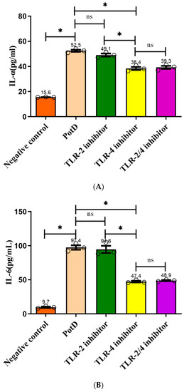 Toll-like receptors (TLR) 2 and 4 were separately or collectively blocked using anti-TLR2 and anti-TLR4 monoclonal antibodies in an effort to prove that rPotD upregulated cytokine production through binding with macrophage cell surface recognition receptors. ELISA results demonstrated that production of the three pro-inflammatory cytokines increased significantly after TLR4 was blocked compared with the rPotD group (Figure 10), especially IL-6 and TNF-α, which declined from 95.68 ± 2.34 and 112.73 ± 1.74 pg/mL to 46.36 ± 0.28 and 67.68 ± 7.68 pg/mL, respectively. The declines were nearly two-fold. However, in the anti-TLR2 or anti-TLR2/4 group, secreted levels of all of the three pro-inflammatory cytokines had no significant changes (p > 0.05). Taken together, these results indicated that TLR4, rather than TLR2, mediated PotD-induced expression of pro-inflammatory cytokines in macrophages in H. parasuis infection.