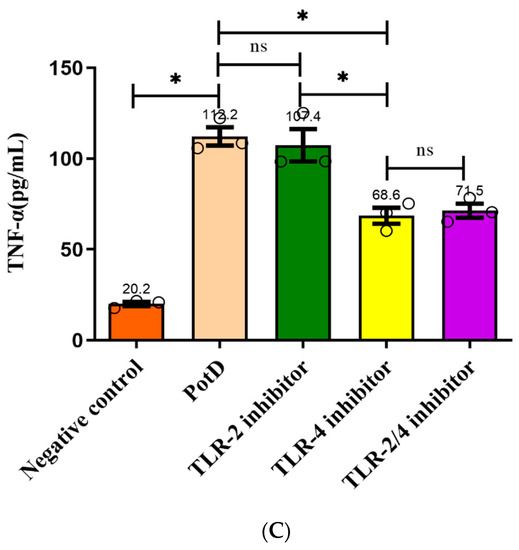 Analysis of the recognition receptor of PotD. Anti-TLR2 and anti-TLR4 monoclonal antibodies were used to block their corresponding Toll-like receptor or both TLR-2/4. Protein levels of (A) IL-1β, (B) IL-6, and (C) TNF-α in the culture supernatants were determined by ELISA. These experiments were repeated 3 times. Each error bar represents one standard deviation from the mean.