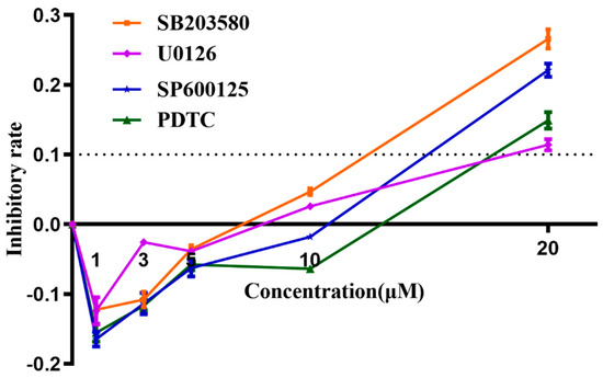 An MTT assay was carried out to determine the cytotoxicities of signaling pathway inhibitors SB203580 (p38-MAPK inhibitor), U0126 (Erk1/2 inhibitor), SP600125 (JNK inhibitor), and PDTC (NF-κB inhibitor), prior to being applied to block their corresponding signaling pathways. According to manufacturing instructions, the recommended concentration for SB203580/U0126/SP600125/PDTC was 1–50 μM/1–20 μM/1–100 μM/10–100 μM, respectively. However, in this study, we found 10 μM of each signaling pathway inhibitor induced a slight inhibiting effect on cell line Raw 264.7, while 20 μM of each inhibitor, especially the SB203580 and SP600125, demonstrated significant higher levels of inhibitory effects on cell growth (inhibitory rate > 10%) (Figure 11). The Raw 264.7-inhibitory rates for SB203580/U0126/SP600125/PDTC were 26.65%/12.60%/22.97%/14.37%, respectively. Thus, in later studies, we used 10 μM each as the optimized working concentration, which was efficacious enough that this concentration was much higher than their corresponding IC50 for signaling pathway inhibition according to the product specifications, and 10 μM of these inhibitors had negligible cytotoxic effects to cell line Raw 264.7.