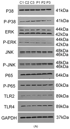 Raw 264.7 macrophage was treated with 15 μg/mL of purified rPotD for 12 h, then spun down. The total protein of rPotD-treated and untreated macrophages was extracted. Briefly, the pelleted suspension cells were resuspended in ice-cold PBS (pH = 7.2−7.4) for 15 min, supplemented with Halt Protease Inhibitor Cocktail and HaltTM Phosphatase Inhibitor Cocktail (Thermo Scientific) to prevent proteolysis and maintain phosphorylation status of proteins. Afterwards, the collected cells were resuspended in phosphate buffered saline (Roche) and RIPA lysis buffer and allowed to sit in an ice bath for 15 min. The concentrations of the total protein were determined using a Modified BCA Protein Assay Kit (Sangon Biotech). Aliquots corresponding to 50 μg of each sample were analyzed using Western blotting (WB) analysis, which was carried out routinely as stated above (potD Mutant Identification). LPS group and PBS group were set as positive and negative control, respectively. The primary antibodies included p-Erk1/2, Erk1/2, p-p38-MAPK, p38-MAPK, p-JNK, JNK, p-p65(NF-κB), p65(NF-κB), TLR2, and TLR4. All antibodies were obtained from Santa Cruz Biotechnology Inc., Santa Cruz, CA, USA. The grayscale bands were developed by the ChemiDocTM XRS+ system with Image LabTM software (Bio-Rad). Band luminosity intensity was quantified using ImageJ software. IOD values were analyzed by AlphaEaseFC software, wherein GAPDH was used as internal reference gene.