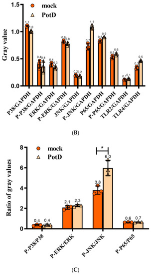 For further investigation of the signal pathways for PotD engaged in boosting pro-inflammatory cytokines, Western blotting was carried out to determine three MAPK pathways, including p38, ERK, JNK signal molecules, and another RelA(p65) signal molecule belonging to the NF-κB pathway. As outlined in Figure 12, only the phosphorylation of JNK–MAPK in Raw 264.7 cells induced by PotD stimulation was augmented significantly, while the expression levels of the other signal molecules fluctuated within a statistically insignificant range (p > 0.05). The raw data of western blotting used in this study in Supplementary Materials, Figure S4.