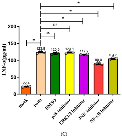In a follow-up study, we aimed to characterize the details of the stimulation of signal pathway stimulation by rPotD, inhibitors SB203580 (p38–MAPK inhibitor), U0126 (Erk1/2–MAPK inhibitor), SP600125 (JNK–MAPK inhibitor), and PDTC (NF–κB inhibitor) were applied to block their corresponding signal pathway in Raw 264.7, with their supernatants being collected for detection of cytokines IL–1β, IL–6, and TNF–α via ELISA. Figure 13 plots the secretion levels of these three cytokines under different treatments, wherein a DMSO group was set as a control in parallel. Results showed that all these cytokines were downregulated significantly when the JNK–MAPK signal pathway was blocked, which coincided with our finding in the WB assay. However unexpected and noticeable, in ELISA, these cytokines were also downregulated when p65 (NF–κB) was blocked, especially the secretion levels of IL–1 and –6. We postulated that ELISA is used to detect the functional output of the signal pathways and WB is used to detect the protein expression level change. Thus, we concluded that the NF-κB inhibitor (PDTC) also induced a certain degree of reduction. These results suggest that the PotD-induced cytokine production likely primarily depends on the phosphorylation of JNK–MAPK signal molecule and, to some extent, harnesses the NF–κB signal pathway as an alternative two-tiered circuit.