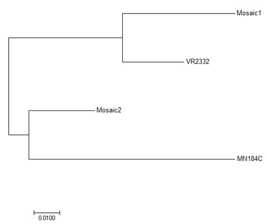Phylogenetic analysis of the GP5 Amino acid sequence of the two Mosaic sequences, MN184C and VR2332. The analysis was done via the neighbor-joining method using MEGA7.0.