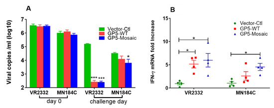 Vaccination-induced humoral and cellular responses. (A) The virus neutralization was expressed as viral copy numbers (log10 scale), as measured by RT-qPCR in cell supernatants after the infection of MARC-145 cells with pre-incubated serum–virus mixtures. (B) The expression of IFN-γ mRNA as fold changes, by either VR2332 or MN184C-stimulated PBMCs collected on the challenge day. Each dot represents the value of one animal. The variation is expressed as standard error of the means. There were three independent replications. Significant differences were calculated by a two-way ANOVA or Student’s t test (* p < 0.05, *** p < 0.0001).