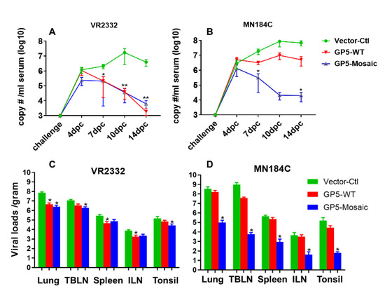 Viral loads in serum of both GP5-WT and GP5-Mosaic-vaccinated groups were significantly lower than those in the vector-control group at 7, 10 and 14 days after challenge with VR2332 (* p < 0.05, ** p < 0.01) (Figure 3A). Therefore, the capacity of reducing VR2332 virus loads in serum was relatively similar between the GP5-Mosaic and the GP5-WT vaccines. Furthermore, there was a steady decrease in viral loads from 4 days to 14 days after challenge in both GP5-WT and GP5-Mosaic vaccinated groups, while viral loads increased during the course of challenge and reached their peak at 10 days post-challenge (DPC), then declining slightly at 14 DPC in the vector-control group (Figure 3A). In contrast, the viral loads in serum of animals receiving the GP5-Mosaic-vaccine were significantly lower than those of animals receiving the GP5-WT vaccine or those of vector-control animals at 7 and 14 DPC with MN184C (* p < 0.05) (Figure 3B), which was different compared to VR2332-challenged groups. Viral load levels in GP5-WT vaccinated animals, increased during the infection with MN184C and reached their peak at 10DPC, which is comparable to the vector-control group. The viral loads in GP5-Mosaic vaccinated animals decreased steadily from 4 to 10 DPC and remained unchanged until 14 DPC (Figure 3B). Furthermore, the viral loads in lung, TBLN, spleen, ILN and tonsils were significantly lower in GP5-Mosaic-vaccinated animals than those in the vector-control group (* p < 0.05) after challenge with MN184C, while those of the GP5-WT group were similar or slightly lower compared to the vector-control group (Figure 3C). Viral loads in the lungs, TBLN, and tonsil were significantly lower in GP5-Mosaic-vaccinated animals than those in the vector-control group (* p < 0.05) after challenge with VR2332, while those of the GP5-WT group were significantly lower in the lungs, spleen and ILN compared to the vector-control group (* p < 0.05). There was no significant difference in VR2332 virus loads between the GP5-Mosaic and GP5-WT groups (Figure 3D).