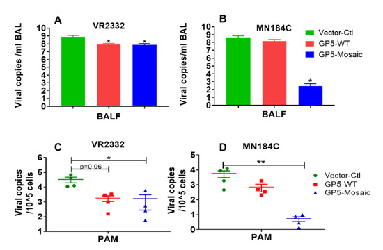Tests in PAMs and BAL fluids showed a similar pattern in which the viral loads in both the GP5-Mosaic and GP5-WT groups were lower than those in the vector-control group after challenge with VR2332 (Figure 4A,C), meanwhile only the viral loads of GP5-Mosaic-vaccinated animals were significantly lower than those in the vector-control animals after challenge with MN184C (* p < 0.05 and ** p < 0.01, respectively), furthermore there was no apparent difference in MN184C viral loads between GP5-WT and vector-control animals (Figure 4B,D).