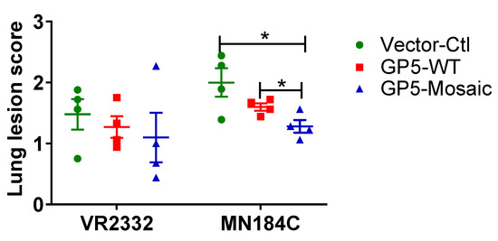 The lung lesion scores after challenge with MN184C were significantly lower in GP5-Mosaic-vaccinated animals than those in both GP5-WT and vector-control animals when evaluated using nine sections of lung (Figure 5 right panel, p < 0.05). In contrast, after VR2332 challenge, lung lesion scores were lower on average in both the GP5-Mosaic and GP5-WT groups than those in vector-control animals. There were no significant differences between the lung lesion scores of GP5-WT and GP5-Mosaic-vaccinated groups after challenge with VR2332 (Figure 5).