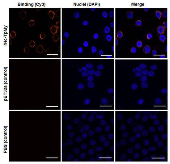 The goat PBMCs cultured with rHc-TpMy and immunofluorescence assay using a confocal microscope imaging system revealed that rHc-TpMy protein could bind on surface of the goat PBMCs. As indicated in Figure 2, nuclei of the cells stained with blue florescence and target protein with red color. However, there was no florescence observed in control sections, either in PBS control or pET32a control group (Figure 2).
