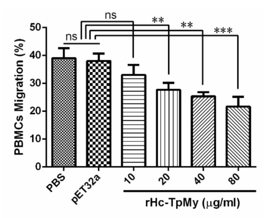 Inhibition effects of rHc-TpMy on cell migration. PBMCs with differential concentrations of rHc-TpMy protein, pET32a protein or control buffer (PBS) were stimulated and the random migration was determined. The difference between the mean values was calculated using ANOVA. PBMCs used for all replicates of distinct treatments in each experimental repetition were derived from the same goat. The data are presented as the mean ± SD and are representative of three independent experiments (** p < 0.01, *** p < 0.001 and ns: non-significant).
