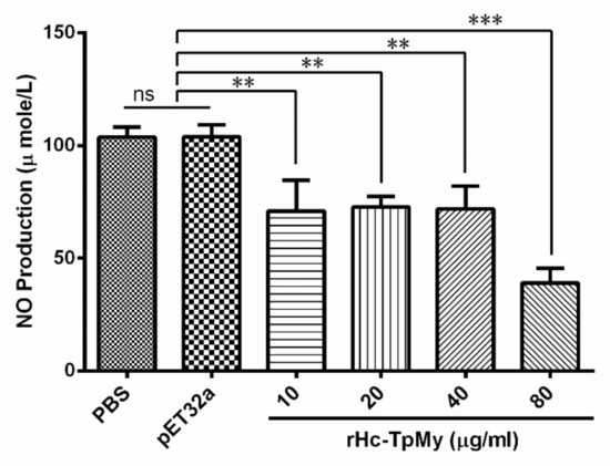 Impacts of rHc-TpMy on nitric oxide production. PBMCs were cultured with differential concentrations of rHc-TpMy protein, pET32a protein or control buffer (PBS), and intracellular nitrite concentration in the PBMCs was measured by using Griess assay. PBMCs used for all replicates of distinct treatments in each experimental repetition were derived from the same goat. The data are presented as the mean ± SD and representative of three independent experiments (** p < 0.01 and *** p < 0.001, and ns: non-significant).