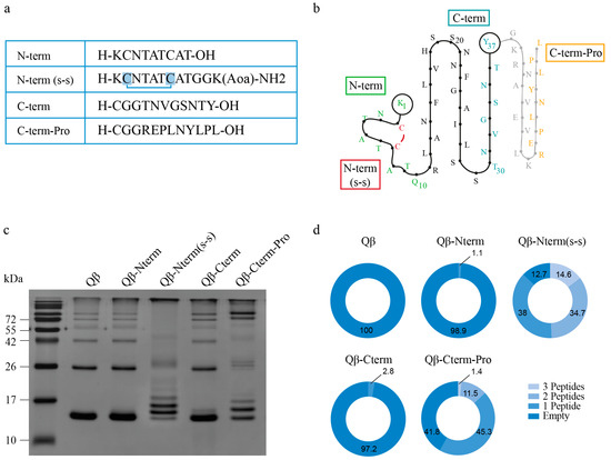 Qβ-VLPs based vaccine generation against candidate IAPP peptides. (a,b) Human IAPP amino acids (aa) sequence of the chosen peptides being coupled in a linear (a) and secondary (b) structure view: A N-terminal peptide without disulfide bond (N-term, in green); a N-terminal peptide with disulfide bond (s-s) between cystein 2 and 7 (N-term(s-s), in green and in red the disulphide bond)); a C-terminal peptide presents in the final 37-aa sequence (C-term, in light blue); and a C-terminal peptide (C-term-Pro, in orange) presents in the aa-sequence before final cleavage to the 37-aa long IAPP. (c) Firstly, Qβ-VLPs were chemically derivatized to heterobifunctional cross-linkers via Lys-aa (SMPH for the N-term, C-term and C-term-Pro peptides and s4FB for the N-term (s-s) peptide) and secondly coupled to the mentioned peptides via Cys-aa or an Aoa-group for the SMPH and the s4FB, respectively. The following vaccines were obtained: Qβ-Nterm (for coupling to N-term peptide without disulfide bond); Qβ-Nterm (s-s) (for coupling to the N-term (s-s) peptide with the disulfide bond); Qβ-Cterm, (for coupling to the C-term peptide); and Qβ-Cterm-Pro (for coupling to the C-term-Pro peptide). Coupling efficiency was analysed on a 15% SDS-PAGE under reducing condition. (d) To have detailed information of how many peptides per subunits were present, densitometry analysis was performed using Fiji ImageJ. The percent of the measured bands is displayed. Total area is represented as 100%. Qβ-VLPs, Virus-like particles derived from the bacteriophage Qβ; (s-s), disulphide bond; aa, amino acid; Lys, Lysin; Cys, Cystein, Aoa, aminooxyacetic group on the side chain of Lysin.