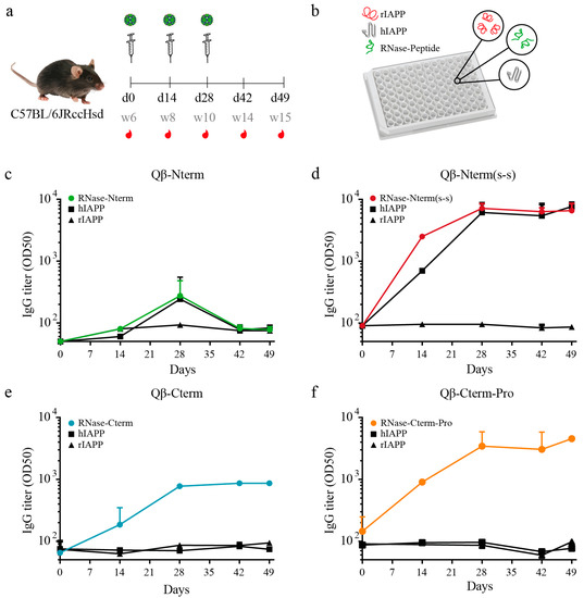 Immunogenicity control in C57BL/6 mice with the generated candidate vaccines. (a) Immunization scheme of 6 weeks old C57BL/6 mice. Mice were immunized at day 0 (d0), corresponding to the age of 6 weeks (w6). Boost was performed at day 14 (d14, w8) and day 28 (d28, w10). Blood was collected at day 0, day 14, day 28, day 42 and day 49 and serum was isolated. (b) 96-well ELISA plates were coated either with the corresponding peptide coupled on the vaccine used for immunization (in this case coupled to RNase), or with rat IAPP (rIAPP) or human IAPP (hIAPP). (c–f) Total serum IgG of the mice receiving: the Qβ-Nterm vaccine (n = 4) (c) recognizing the RNase-Nterm peptide (in green); the Qβ-Nterm (s-s) vaccine (n = 4) recognizing the RNase-Nterm (s-s) peptide (in red); the Qβ-Cterm vaccine (n = 4) recognizing the RNase-Cterm peptide, and the Qβ-Cterm-Pro vaccine (n = 4) recognizing the RNase-Cterm-Pro peptide (in orange). Total IgG recognizing the hIAPP (square) and rIAPP (triangle) are shown in black. OD50 values are calculated as the corresponding dilution reaching to the half value of OD450. Data are the means ± SEM. d, day; w, week; rIAPP, rat IAPP; hIAPP, human IAPP; RNase-peptide, peptide covalently coupled to the corresponding peptide being either Nterm, Nterm (s-s), Cterm or Cterm-Pro.