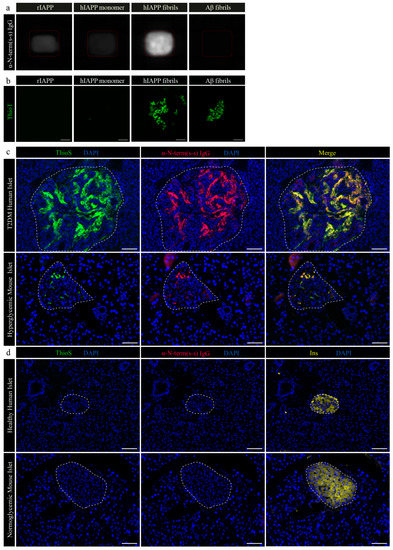 IgGs derived from C57BL/6 mice immunized with the Qβ-N-term (s-s) vaccine recognize only hIAPP aggregates on human and on hyperglycemic hIAPP transgenic mouse pancreatic tissue. (a) Nitrocellulose membrane coated either with rat IAPP (rIAPP), human IAPP monomers (hIAPP monomer), human IAPP fibrils (hIAPP fibrils) or a control amyloidogenic protein forming aggregates derived from amyloid beta (Aβ fibrils) followed incubation with purified polyclonal antibodies. After incubation with an anti-IgG conjugated to horseradish peroxidase, the membrane was developed with a chemiluminescent substrate. (b) Immediately after membrane blotting with the specified antigens, solutions were stained with a ThioflavinT (ThioT) solution and imaged to prove the state of the coated proteins. (c) Representative human pancreatic islet from a severe type 2 diabetes mellitus (T2DM) patients and a hyperglycemic transgenic mouse expressing hIAPP. Tissues were stained with ThioflavinS (ThioS) to confirm the presence of amyloidogenic aggregates (c, left panel, ThioS in green, DAPI in blue) and with an IgG derived from mice immunized with the Qβ-N-term(s-s) vaccine (c, middle panel, α-N-term (s-s) IgG in red, DAPI in blue). A co-localization staining (right panel, merge) was generated to authenticate the specificity of the IgGs. (d) Representative human pancreatic islet from a healthy pancreas and a wild-type mouse. ThioS staining (left panel) and polyclonal staining were checked on healthy human pancreatic tissue and wild-type normoglycemic mouse tissue. β-cells were visualized by staining with an anti-insulin (Ins, right panel) antibody. rIAPP, rat IAPP; hIAPP, human IAPP; Aβ, amyloid beta; α-N-term (s-s) IgG, polyclonal IgG derived from the Qβ-N-term (s-s) vaccinated C57BL/6 mice; ThioT, ThioflavinT; T2DM, type 2 diabetes mellitus; ThioS, ThioflavinS. Scale bars: 20 μm.